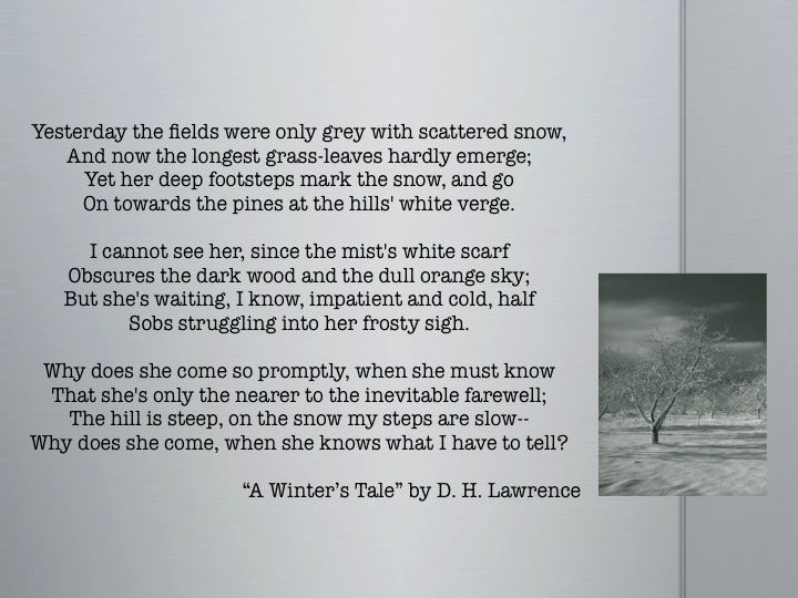D. H. Lawrence was an English writer and poet who focused extensively on modernity and industrialization, and the consequences thereof. While D.H. Lawrence tackles many different themes and ideas in his works, his focus on Shakespeare's The Winter's Tale through his own adaptation remains a very significant aspect of his career. Published in 1916, "A Winter's Tale" draws out the significance of time and weather created in the original play, and leads up to the narrator trying to understand the motives of the female figure described in the poem.